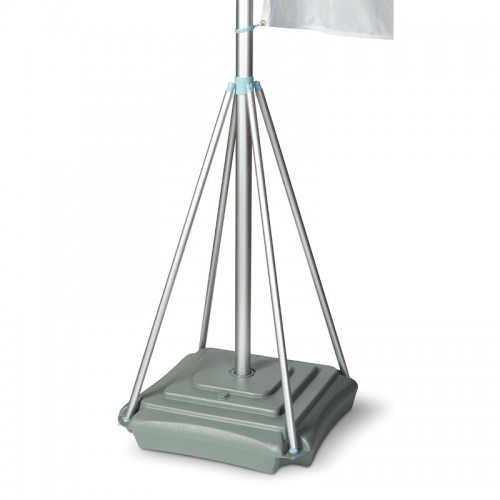 The horizontal section (flag arm) is a single aluminium section. It has 4 reinforcement sections that are connected to the base and the main flagpole to reinforce the stability of the assembly. Square base with rounded edges that can be filled with water or sand. Includes 4 small double plastic rings for attaching the flag to the upper flag arm, and 9 large double rings for attaching the flag to the main telescopic flagpole. |