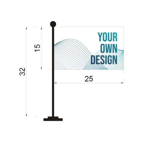 Pakke bestående af et rektangulært vandret flag på 25x15 cm med design, der kan tilpasses, en 32 cm høj bordflagstang og en cirkulær stander.