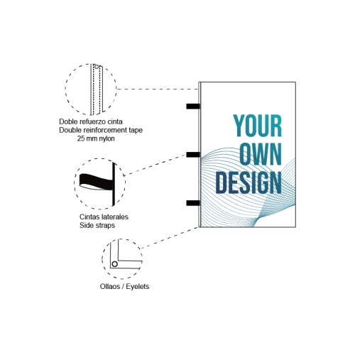 Rectangular flag made vertically in polyester fabric. It does not have an upper or lower sleeve. It has a perimeter reinforcement tape, 2 eyelets and ribbons on the left side to make it easier to tie it to the mast. You can select the width and height according to the measurements you need. The textile surface of the flag can be customised with colours and/or designs of your choice.
