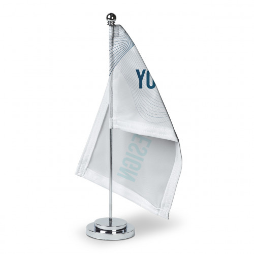 Pack composé d'un drapeau horizontal rectangulaire de 25x15 cm au design personnalisable, d'une mât de table de 32 cm de haut et d'un support circulaire.