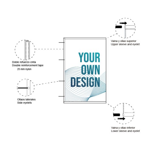 Pod The sheath of the flag is made according to the width of the product. Closed sleeve at top and bottom. Reinforcement tape and eyelets and ties on the left side every 100cm. Eyelet 1cm inside diameter. |