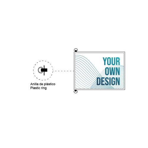 Obdĺžniková vlajka vyhotovená vodorovne s dvoma čiernymi krúžkami na ľavej strane na jednoduché umiestnenie na viacerých miestach. Šírku a výšku si môžete vybrať podľa potrebných rozmerov. Textilný povrch vlajky je možné prispôsobiť farbami a/alebo vzormi podľa vášho výberu. Je navrhnutá na použitie ako inštitucionálna vlajka, môžete ju však použiť aj na iné účely.