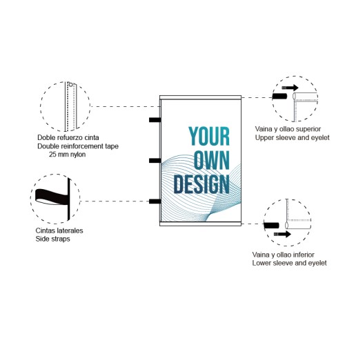 Pravokotna zastava, izdelana navpično iz poliestrske tkanine. Ima lahko zaprt plašč samo na vrhu, lahko pa ji dodamo še enega na dnu, ojačitveni trak, 2 očesi in trakove na levi strani, ki obkrožajo drog. Širino in višino lahko izberete glede na mere, ki jih potrebujete. Tekstilno površino zastave lahko prilagodite z barvami in/ali vzorci po lastni izbiri.